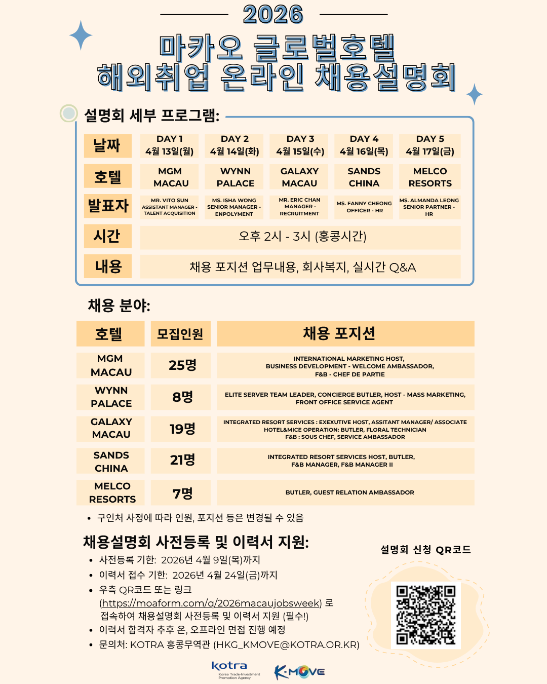KOTRA 홍콩무역관에서는 K-MOVE센터를 운영하며 한국 청년들의 홍콩 및 마카오 취업을 지원하고 있으며, 4월 13일부터 17일까지 5일동안 마카오 글로벌 호텔 5개사(MGM, Galaxy, Sand China, Wynn Palace, Melco)와 함께 "2026 마카오 글로벌호텔 해외취업 온라인 채용설명회"를 아래와 같이 개최할 예정이오니 관심있는 학생 및 지역청년의 많은 참여 바랍니다.